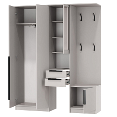 Основными составными компонентами представленных вариаций служат полки, шкафы, вешалки, зеркала, сиденья и комоды.